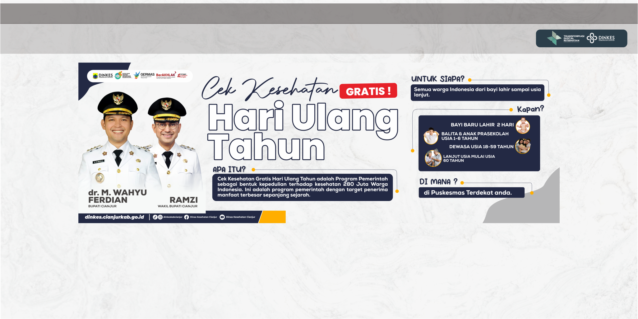 Selamat Datang di Website Resmi Dinas Kesehatan Kabupaten Cianjur. Puji syukur kehadirat Allah SWT, atas izin-Nya website Dinas Kesehatan Kabupaten Cianjur ini dapat diselesaikan. Terima kasih disampaikan kepada semua pihak secara langsung maupun tidak langsung telah memberikan partisipasinya dalam penyusunan website ini. Dalam website ini dijelaskan secara detail mengenai Dinas Kesehatan Kabupaten Cianjur sebagai sebuah unit kerja dengan Program, Kegiatan, Berita dan berbagai prosedur yang dilakukan sebagai sebuah unit lembaga teknis pelayanan dibidang Kesehatan Lingkungan Pemerintah Kabupaten Cianjur.