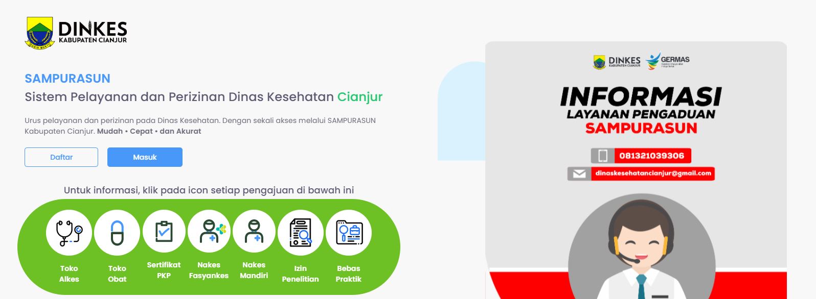 Urus pelayanan dan perizinan pada Dinas Kesehatan. Dengan sekali akses melalui SAMPURASUN Kabupaten Cianjur. Mudah • Cepat • dan Akurat.